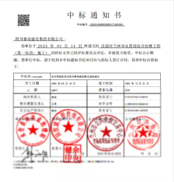 不负春光抢开局,中标喜讯滚滚来。睿凌集团以奔跑跃进的姿态,抢抓新一年发展机遇,全力以赴谋划市场开拓,积极主动对接经营市场。近日,睿凌建设集团有限公司成功中标庄浪河兰州市永登段综合治理工程(第一标段:施工)项目。